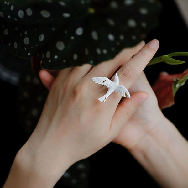 優雅に羽ばたく鳥の姿をモチーフにした、ホワイトバードリング。繊細なデザインと美しいフォルムが、指先を飾る特別なアイテムです。デイリースタイルはもちろん、特別な日にもぴったりのアイテムです。あなたの指先に、自由に羽ばたく幸運を宿してみませんか?