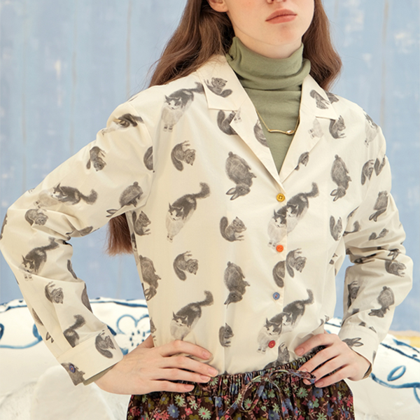 遊び心満載のアニマルプリントヴィンテージシャツ。猫、ウサギ、リスの可愛いプリントが施されており、カジュアルなコーディネートにぴったりのアイテムです。柔らかなオフホワイトカラーが魅力で、シンプルなボトムスと合わせても、華やかさを引き立てます。