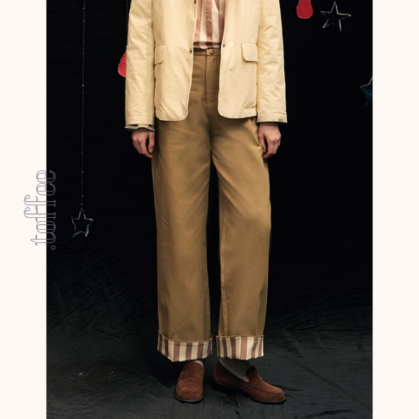 スタイリッシュなシルエットが魅力のルーズストライプカフパンツ。ゆったりとしたデザインはリラックスした着心地を提供し、シンプルながらもおしゃれなコーディネートを実現します。裾の折り返し部分のストライプ柄がアクセントとなり、おしゃれ度を格上げしてくれます。シャツやTシャツ、スニーカーなどと合わせて、カジュアルスタイルを楽しんでくださいね♡