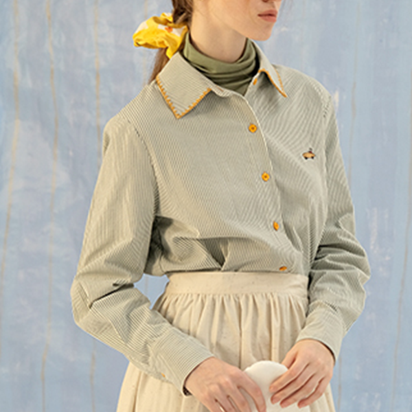 さわやかな印象を与えるグリーンストライプスリムシャツ。胸元にはバゲット刺繍が施されており、シンプルながらも存在感のあるデザインが特徴です。ボトムス次第でカジュアルなスタイルにも、エレガントスタイルにも対応できる一枚。どんなボトムスとも合わせやすく、ワードローブに欠かせないアイテムです。