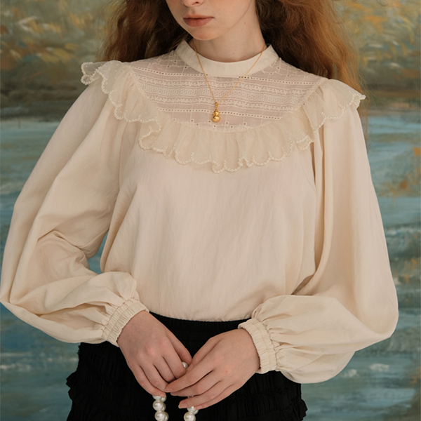 エレガントな雰囲気を醸し出すパールデコラティブバルーンスリーブブラウス。