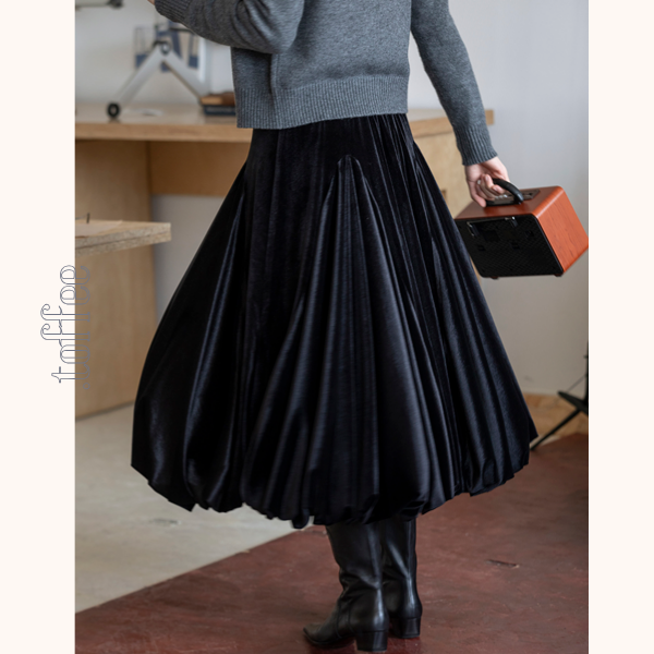 エレガントなミモレ丈プリーツアンブレラスカート。上品なブラックカラーが魅力で、シンプルなトップスと合わせるだけで洗練されたスタイルに仕上がります。プリーツデザインは動くたびに優雅に揺れ、特別な日からカジュアルなシーンまで幅広く活躍する一枚です。