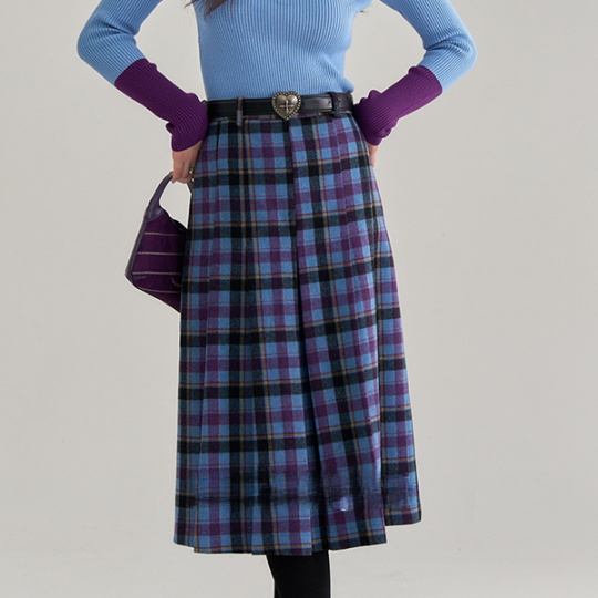 青と紫の美しいチェック柄が印象的なミモレ丈スカート。ハイウエストデザインがスタイルを引き立て、ミモレ丈がエレガントな雰囲気を演出します。シンプルなトップスとの組み合わせが特におすすめで、デイリーコーデからお出かけスタイルまで幅広いシーンで大活躍。着回し力抜群のエレガントな一枚です♡