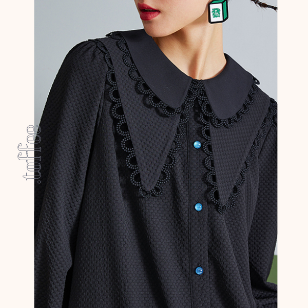 トレンド感溢れるレイヤードカラーブラックシャツワンピース。レースが配された二重襟が特徴的で、シンプルながらも存在感を表し、スタイリッシュな印象を与えます。裾の部分がふわりと広がったキュートなデザインは着るだけで華やかな気分になれそう♡重ね着コーデにもオススメの優秀な一枚です。