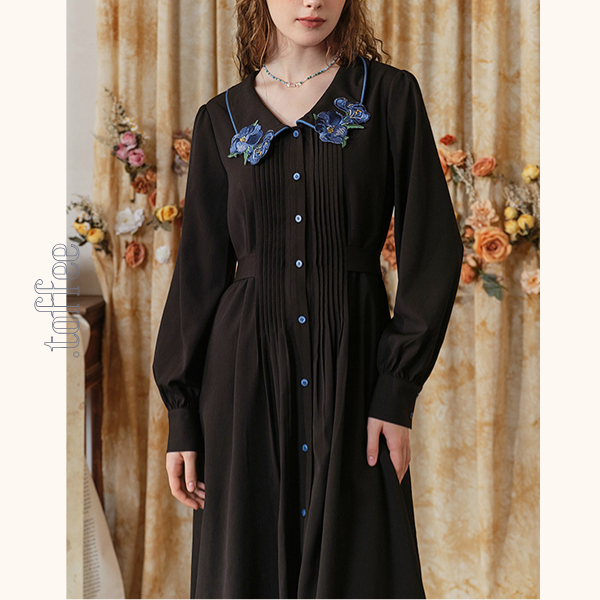 フラワー刺繍が施されたレースヘムブラックワンピース。襟の先には美しい青色のお花の刺繍が施されており、1枚で華やかな印象を与えます。シンプルながらも洗練されたデザインで、特別な日にもデイリーにもおしゃれに着こなせるアイテムです。レースのディテールがエレガントさを引き立て、様々なシーンで活躍します♡シンプルなバックやアクセサリーと合わせることで、より一層おしゃれ度がアップします。
