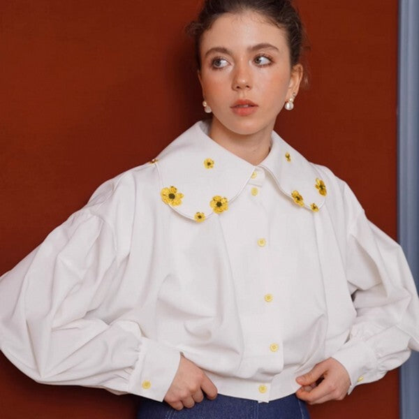 大きな丸襟に散りばめられた黄色のお花刺繍が、華やかさを一層引き立て、ショート丈でふわっと広がる立体的なシルエットが、デザイン性の高さを際立たせます。