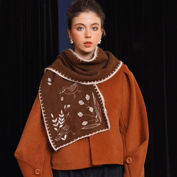 自然と夢が織りなす芸術的アクセサリー:鳥と植物刺繍のショール 《C0192》