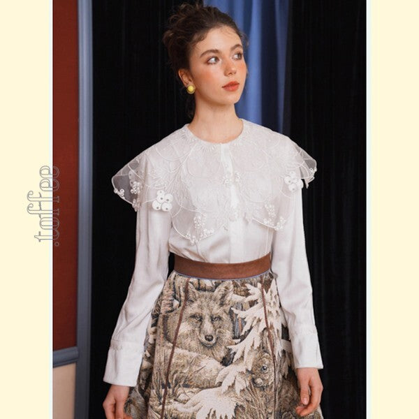 繊細な刺繍レースが織り成すこのブラウスは、まるで妖精の囁きのような美しさを放っています。