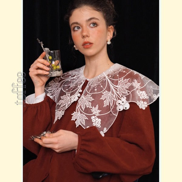同シリーズの刺繍レース襟のブラウスをインナーにレイヤードするのもオススメ◎華やかさと深みをプラスします。