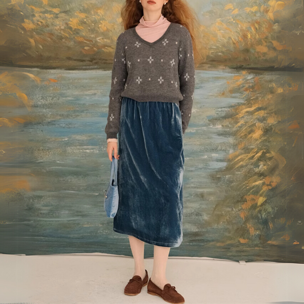 落ち着いた色合いのベルベット素材が、大人の女性らしさを演出するミモレ丈スカート。