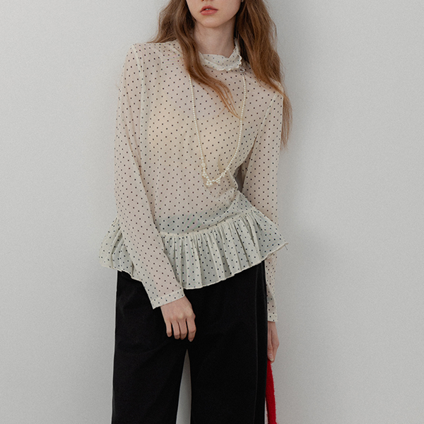 ドット柄が可愛いペプラムブラウス。透け感のある生地と、女性らしいペプラムデザインが、上品で華やかな印象を与えます。シンプルなボトムスと合わせるだけで、おしゃれな着こなしが完成します。デイリーユースはもちろん、デートや女子会など、様々なシーンで活躍してくれる一着です。