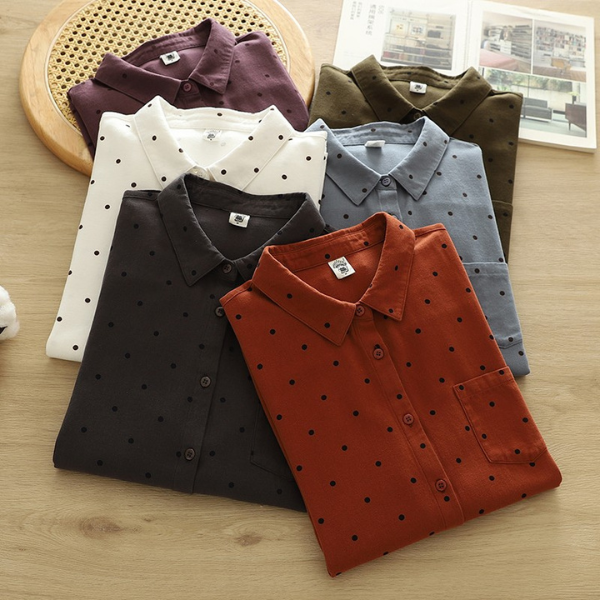 シンプルながらも存在感のあるドット柄シャツ。レギュラーカラーとボタンダウンの組み合わせが、大人の女性らしさを演出します。一枚で着ても、ジャケットを羽織っても様になる万能アイテムです。様々なボトムスと相性抜群で、幅広いスタイルに対応できます。