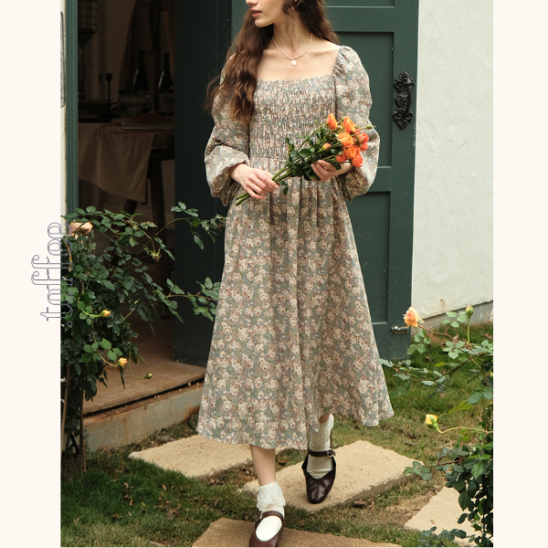 小花柄パフスリーブミモレ丈ワンピース 《Z00745》