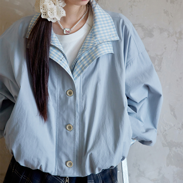 無地×ギンガムチェックのコントラストカラーバルーンジャケット 《Z00765》