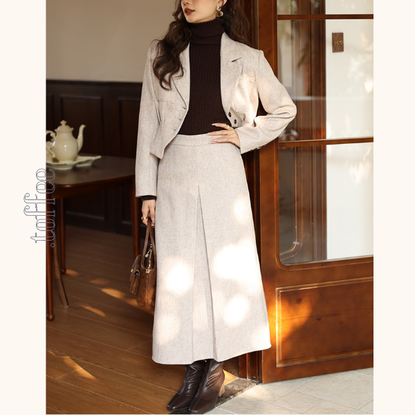 上品な雰囲気漂うショートテーラードジャケットとロングプリーツスカートのセットアップ。