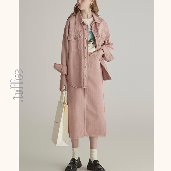 ピンクデニムジャケット&ミモレ丈ストレートスカートセットアップ 《Z00776》