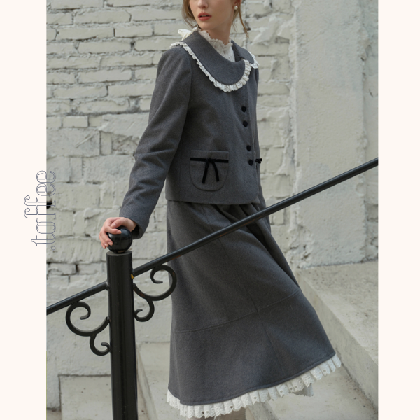 リボン&レースジャケットとAラインミディ丈フレアスカートのセットアップ。