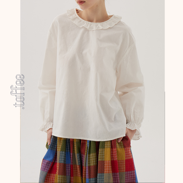 フリルネックが可愛らしい、一枚で主役級の存在感を放つブラウスです。