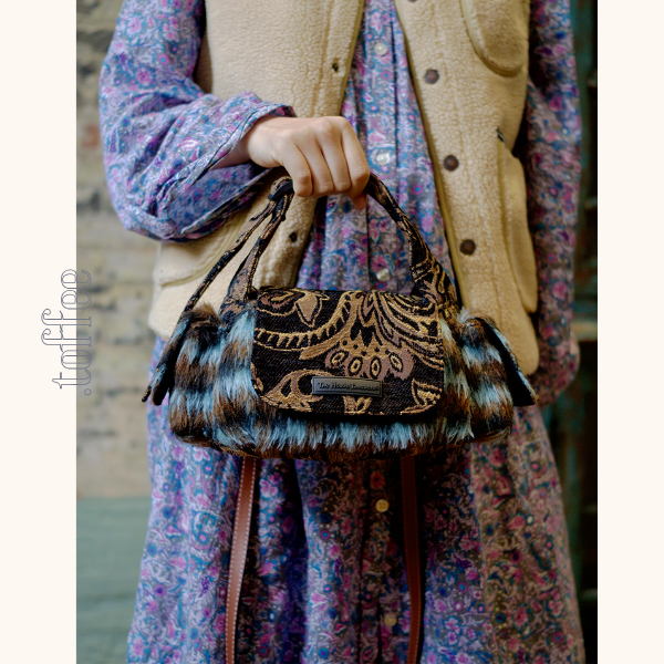 ダマスク織りの美しい柄とふわふわのファーが贅沢に融合したショルダーバッグ。