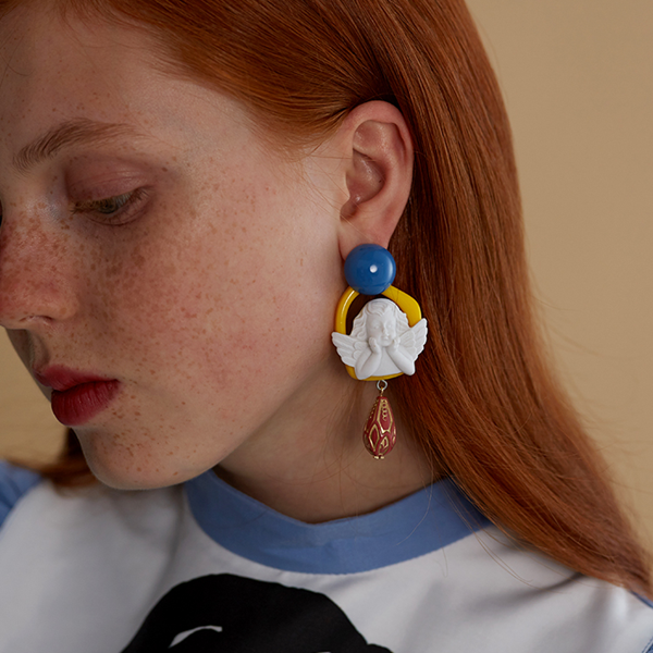 アンティークなエンジェルモチーフが愛らしいドロップイヤーアクセエサリー。